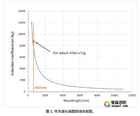 這繪制在圖1中。可見光譜從大約400nm(紫色)延伸到700nm(紅色)。評估波長-波長Wie633nm(用于獲得默認值的波長)處的質量比消光相關性Km在FDS中給出的消光系數為,該系數小于FDS()中使用的默認值,但接近推薦的不確定性下限。7626m2/kg8700 m2/kg