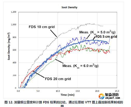 為了比較煙霧引起的能見度和遮擋,我們可以將實驗測量的煙塵密度與 FDS 結果進行比較,圖 12。讀者可以參考 VTT 論文了解密度測量的描述,但該過程使用公式 1、2 和 3,通過計算質量比消光系數作為函數,將使用 MIREX 設備進行的光透射測量轉換為密度的波長。可以看出,5 cm結果落在實驗數據范圍內。