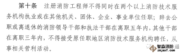 第十條《136號令》和《143號令》就有明確規定,注冊消防工程師不得在兩個及以上機構執業,這里再次重申,那么換個角度,對于注冊消防工程師的數量需求會劇增!同時,后面提到相應的干部一定年限內不得在原機構聘任,為啥?防止權錢交易,不多說,大家都懂的!