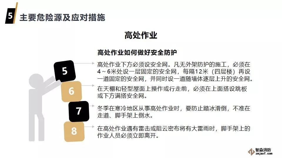 4、作業平臺搭設必須符合規定,牢固可靠,平臺下2m范圍不得堆放物料;作業時,平臺下方嚴禁行人穿過。