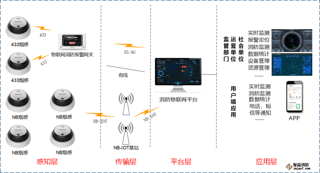 升級版火災探測報警器分兩種通訊方式——NB-IoT和433MHz,NB-IoT煙感直接通過運營商NB基站實現信號與報警傳輸至中心平臺,適用于安裝環境比較分散的場景如九小場所、出租屋、高層住宅;433MHz煙感需要搭配物聯網消防報警網關使用,支持有線LAN或無線2G/4G傳輸,適用于安裝環境比較集中的場景如宿舍。