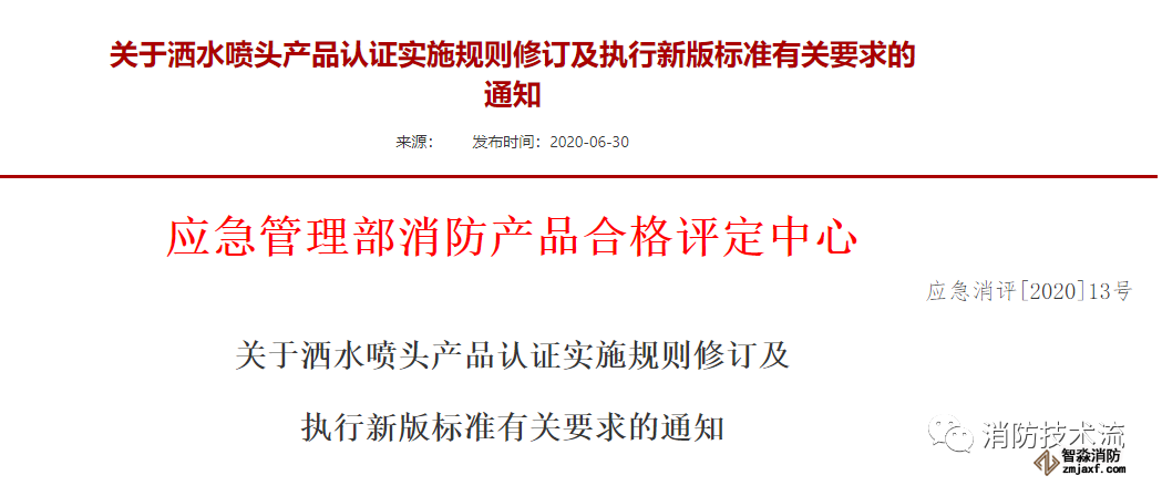 新版標準GB5135.1-2019《自動噴水滅火系統 第1部分:灑水噴頭》于2019年12月17日發布,2020年7月1日起開始實施。經征求有關單位意見,我中心對《消防類產品認證實施規則滅火設備產品 噴水滅火設備產品》中相關內容進行了局部修訂。現就執行新版認證實施規則、新版標準的有關工作要求通知如下: