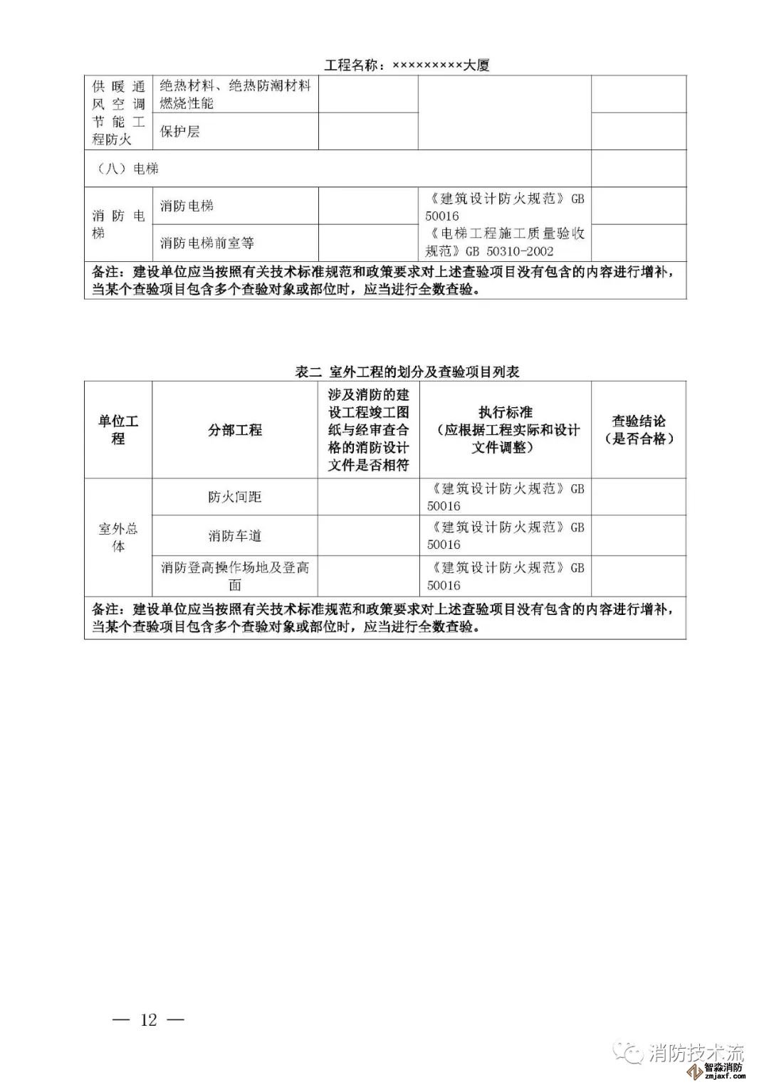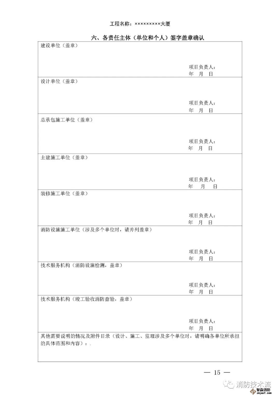 其中附件2和附件5中的填表說明均表示: 建設單位如未直接和符合從業條件的技術服務機構訂立委托合同,在施工過程中自行完成消防設施檢測,或在建設工程竣工驗收消防查驗時自行完成中 消防設施性能、系統功能聯調聯試,則本報告中 “ 技術服務機構 ” 一欄由建設單位及其項目負責人蓋章、簽字,并承擔相應責任和法律后果。